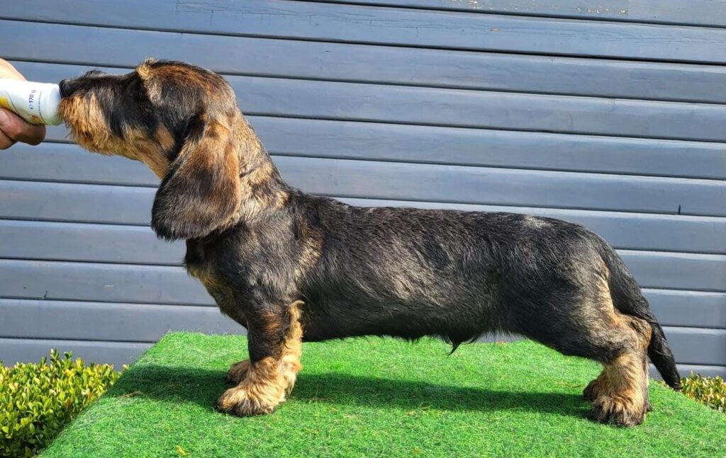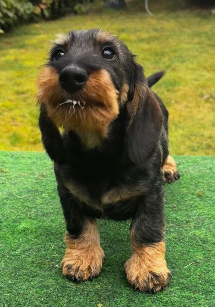 Er ist crd-PRA , OI und merle frei, CDDY / CDDY, F/F und trägt braun – und schwarz-rot.